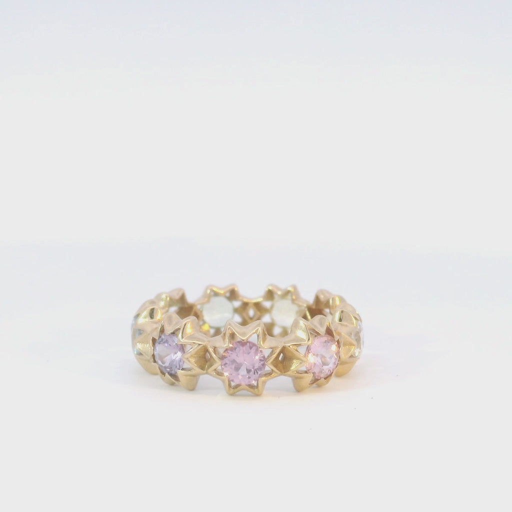 A One of a Kind pastel rainbow starburst band with 2.23ctw of Spinel, Sapphire, Garnet, Beryl, Aquamarine and Citrine set in 17k yellow gold.