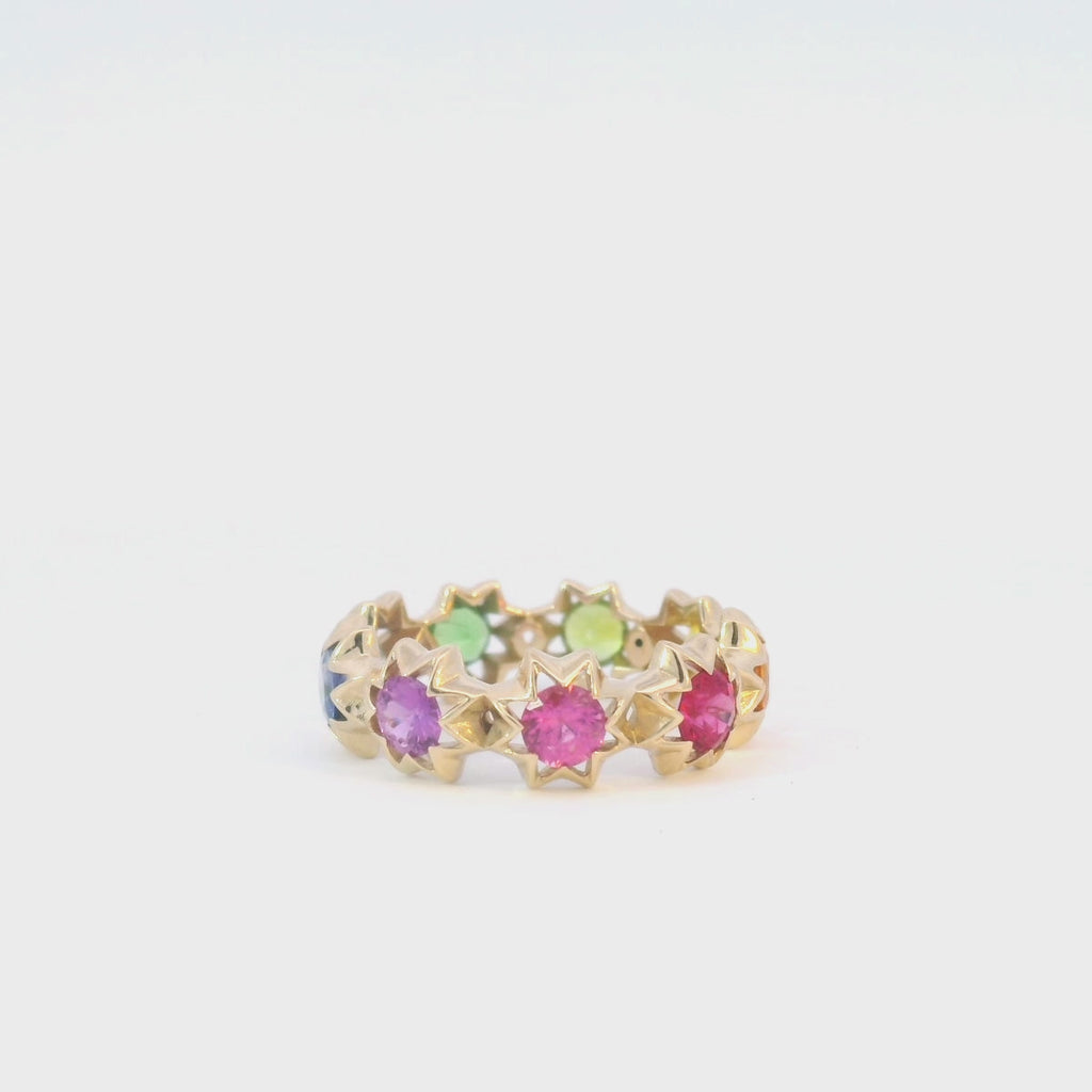 A One of a Kind rainbow starburst band with 2.59ctw of Spinel, Sapphire, and Garnet in 14k yellow gold.